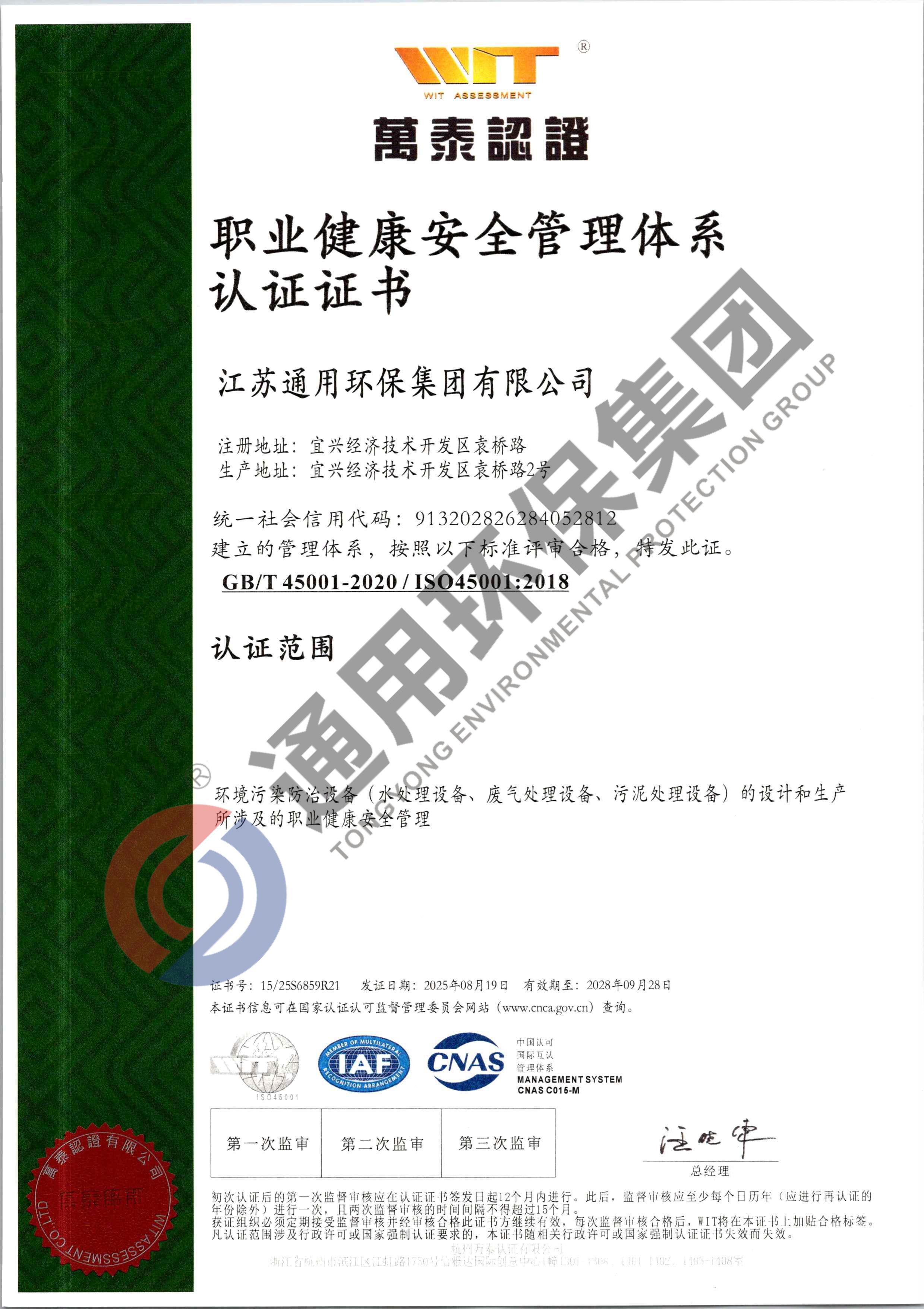 ISO45001职业健康认证证书