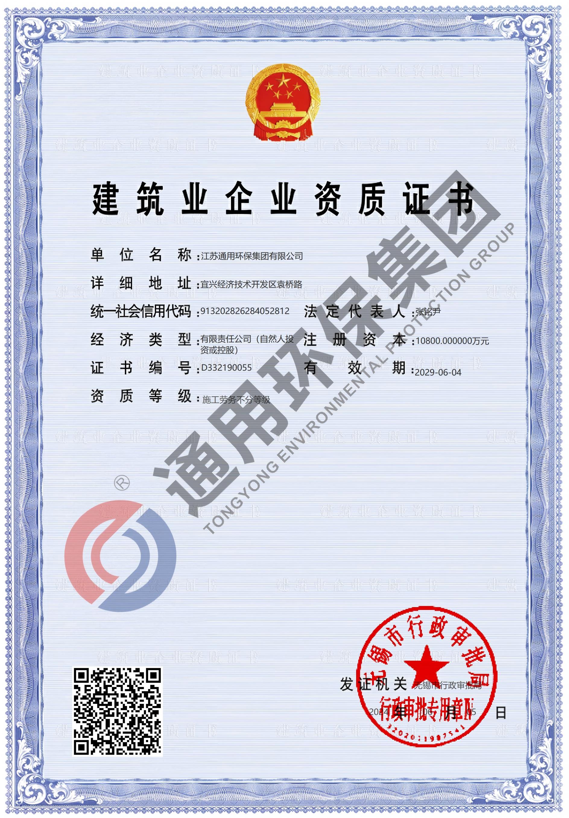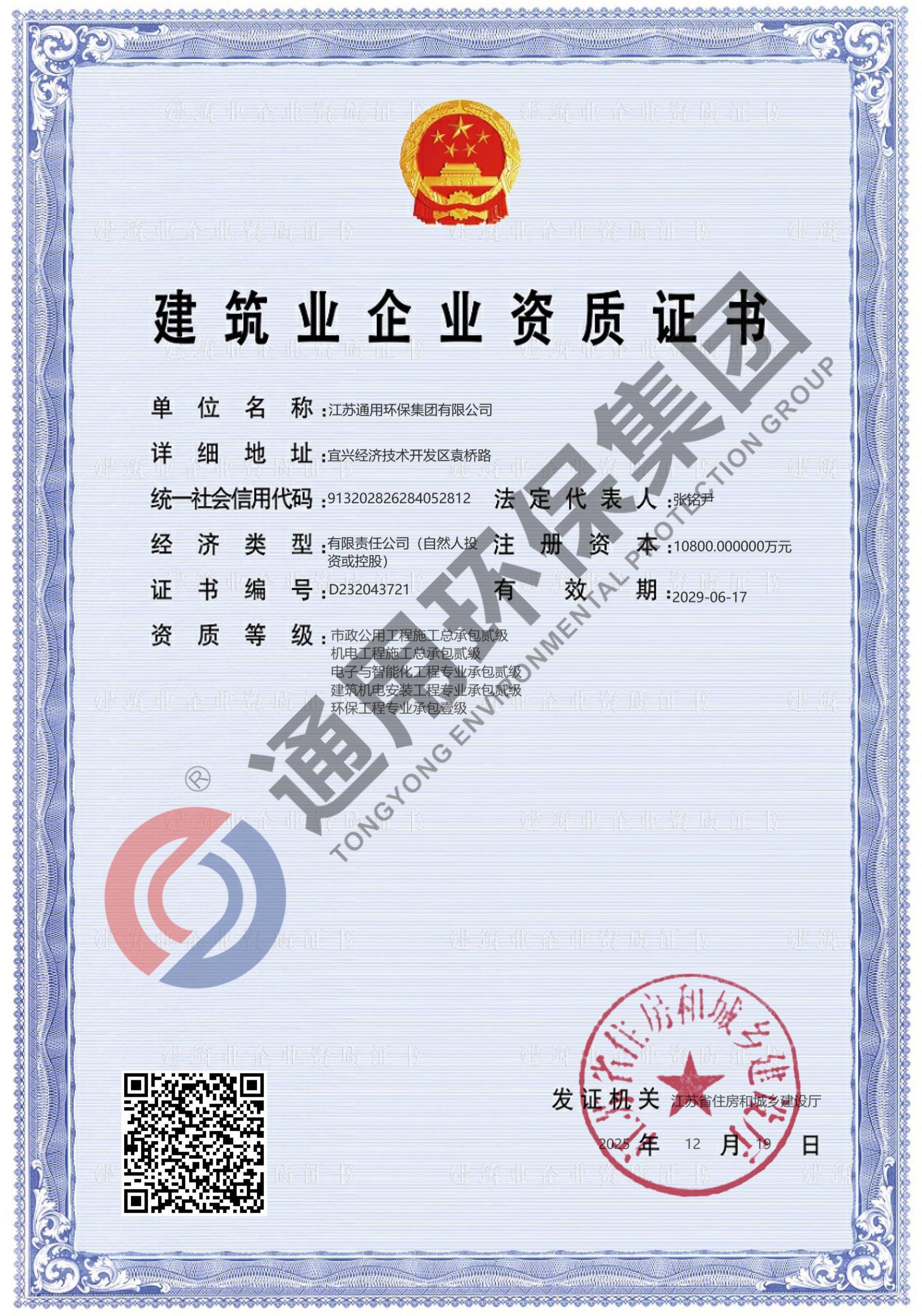 市政总承包贰级、电子与智能化承包贰级、机电安装承包贰级、环保工程专业承包壹级