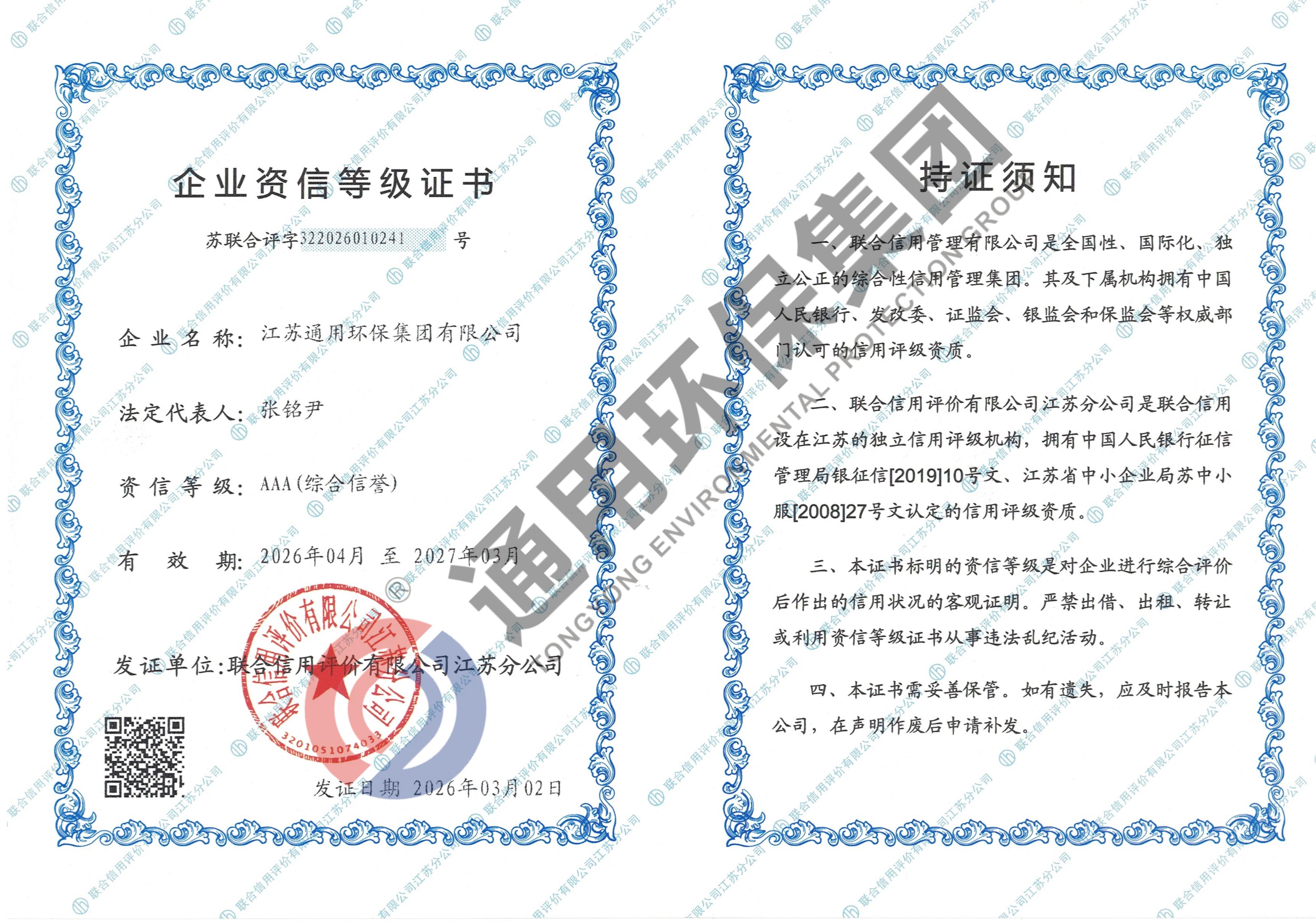 AAA资信等级证书
